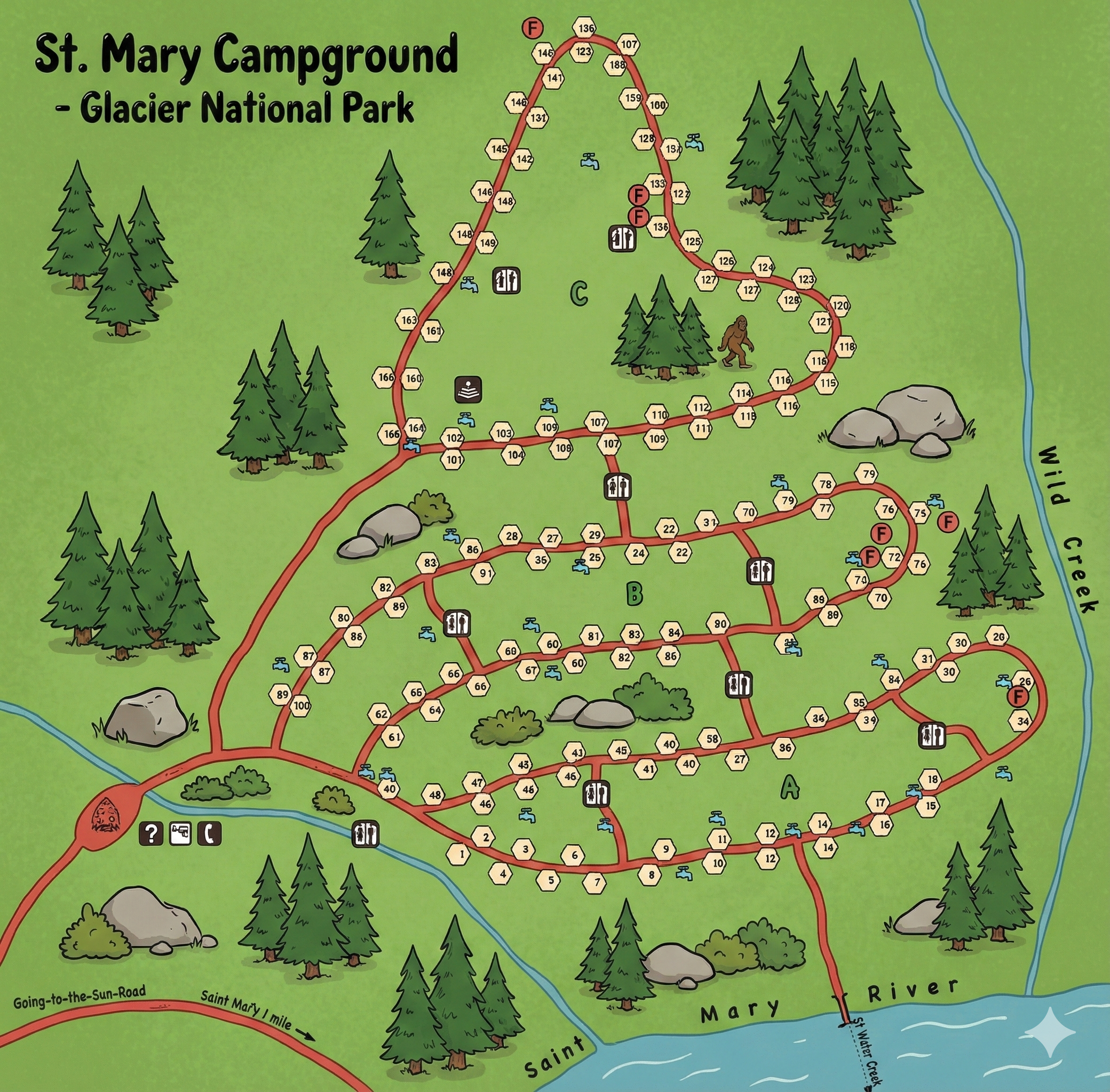 The campground road branches off the Going-to-the-Sun Road just west of the St. Mary River Bridge and loops through A, then B, then C as it climbs away from the river. The bottom edge of the map traces the St. Mary River, while Wild Creek flows down the right side.